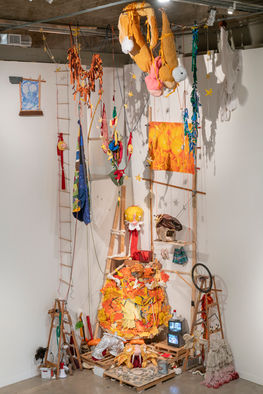 Site-responsive installation at the Visual Arts Center (V.A.C.), gathering drawings, prints, paintings, interactive sculptures, and remnants of performance into a constellation of queer world-building.